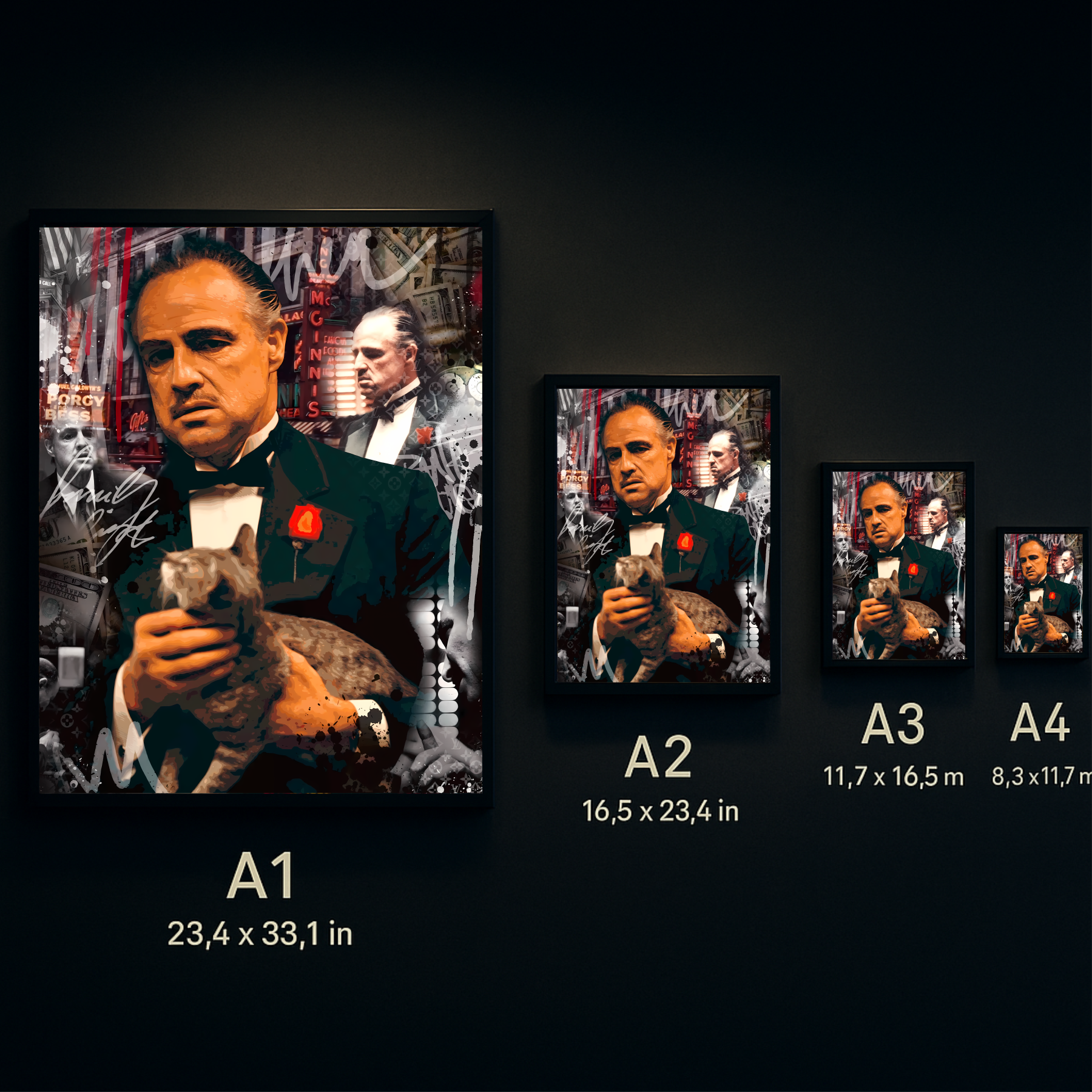 🍷 Step into the dark elegance of power with the “King of the Underworld – Vintage Mob Edition” illuminated wall frame. This masterpiece brings the legendary mob boss to life in a glowing fusion of old-world authority and gritty underworld charisma. The warm LED backlight enhances every shadow, every expression, and every stroke—giving the piece a commanding presence that feels both cinematic and timeless. Surrounded by vintage textures, noir tones, and subtle graffiti accents, this artwork becomes a tribute to loyalty, legacy, and unshakable dominance.