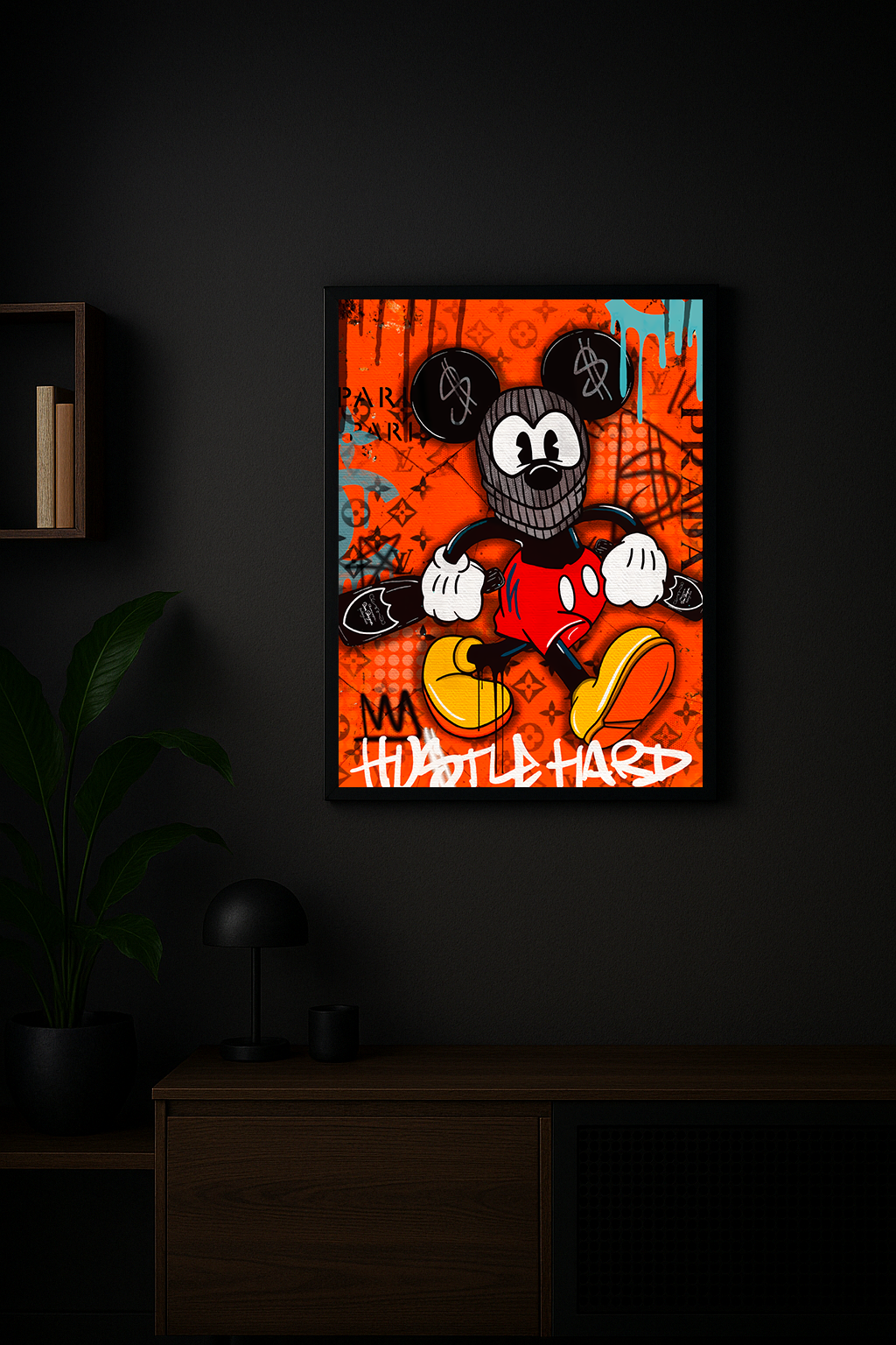 🔥 Unleash bold street-art attitude with the Mickey Grind Mode – Graffiti Edition. This illuminated wall frame transforms the iconic animated character into a fearless urban hustler, blending high-energy graffiti textures, vibrant orange tones, and edgy street symbols. The warm LED backlight enhances every detail — from the mask-style face design to dynamic spray-paint strokes — creating an artwork that radiates confidence, rebellion, and modern pop-culture flair. A striking centerpiece for collectors who appreciate character art with an unapologetically raw twist.