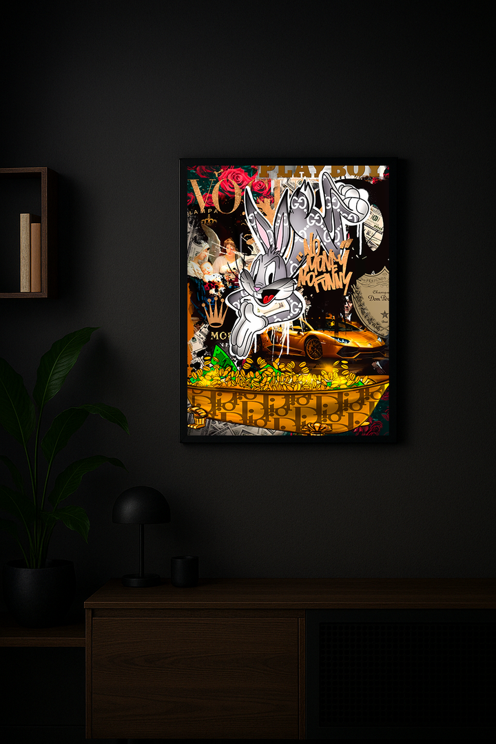 Elevate your space with the bold attitude and luxury-chaos energy of the No Money, No Funny – Vortex Luxe Edition. This illuminated wall frame blends high-end fashion motifs, luxury lifestyle elements, and a playful graffiti-style character expression to create a visually electric statement piece.