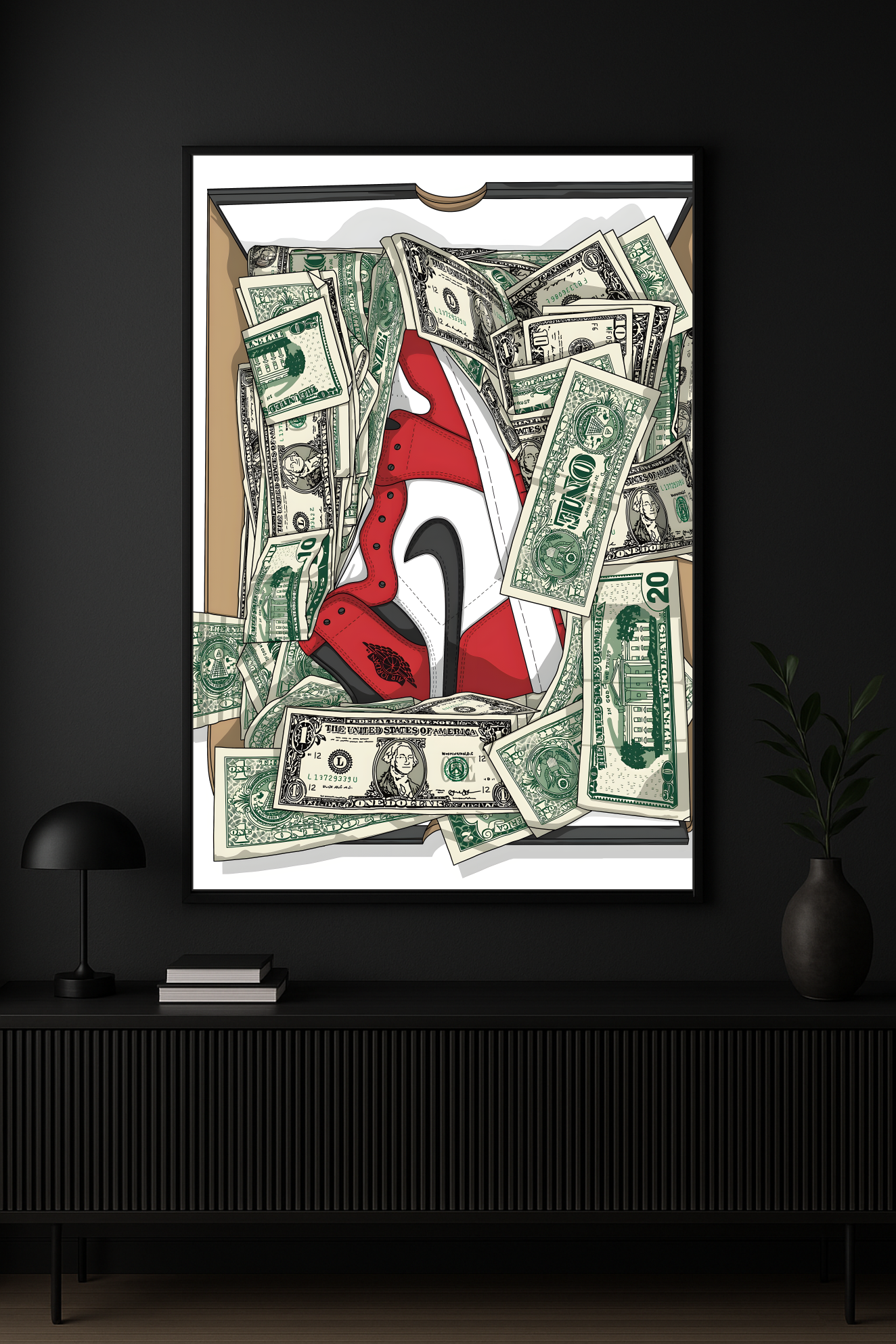 Celebrate the fusion of street culture and luxury with this striking illuminated poster. Featuring a vivid illustration of a red-and-white sneaker surrounded by dollar bills inside a shoebox, it captures the essence of sneaker culture’s value — where art, fashion, and money collide. Perfect for sneakerheads, collectors, and art lovers alike, this ultra-slim poster (only 1 cm thin) adds a bold statement to any space.