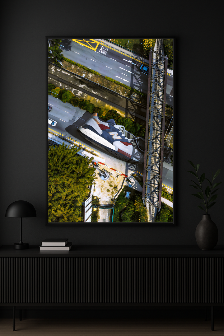 Immerse yourself in the intersection of art, culture, and city life with this illuminated poster. Featuring an aerial view of a massive sneaker mural integrated into an urban landscape, this piece captures the fusion of streetwear and street art — a tribute to the icons that shaped modern sneaker culture.