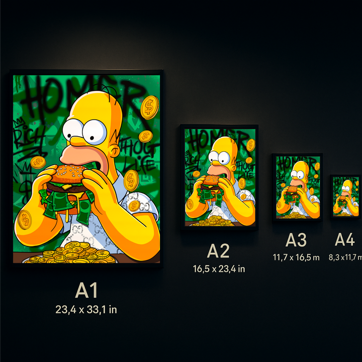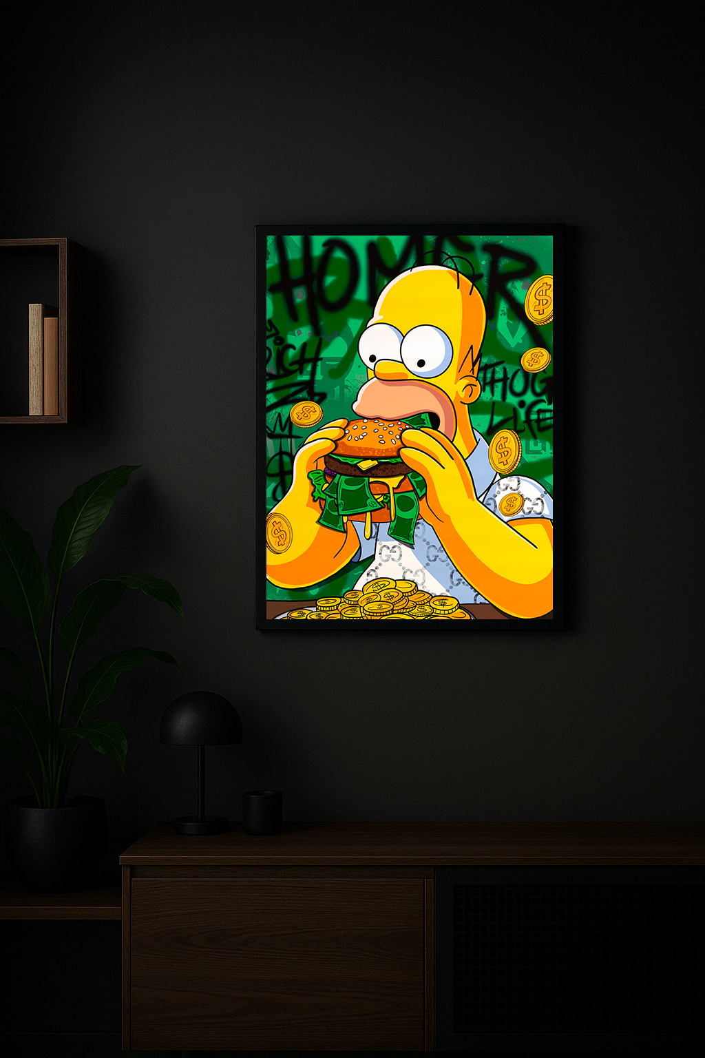 Add bold attitude and street-art charisma to your décor with the Thug Life Bite – Yellow Legend Edition. Centered around a wide-eyed yellow legend taking a massive bite of a cash-stuffed burger, this artwork blends humor, rebellion, and luxury-graffiti aesthetics into one electrifying visual. The vibrant green backdrop, floating gold coins, and bold urban textures create a dynamic composition that instantly commands attention.