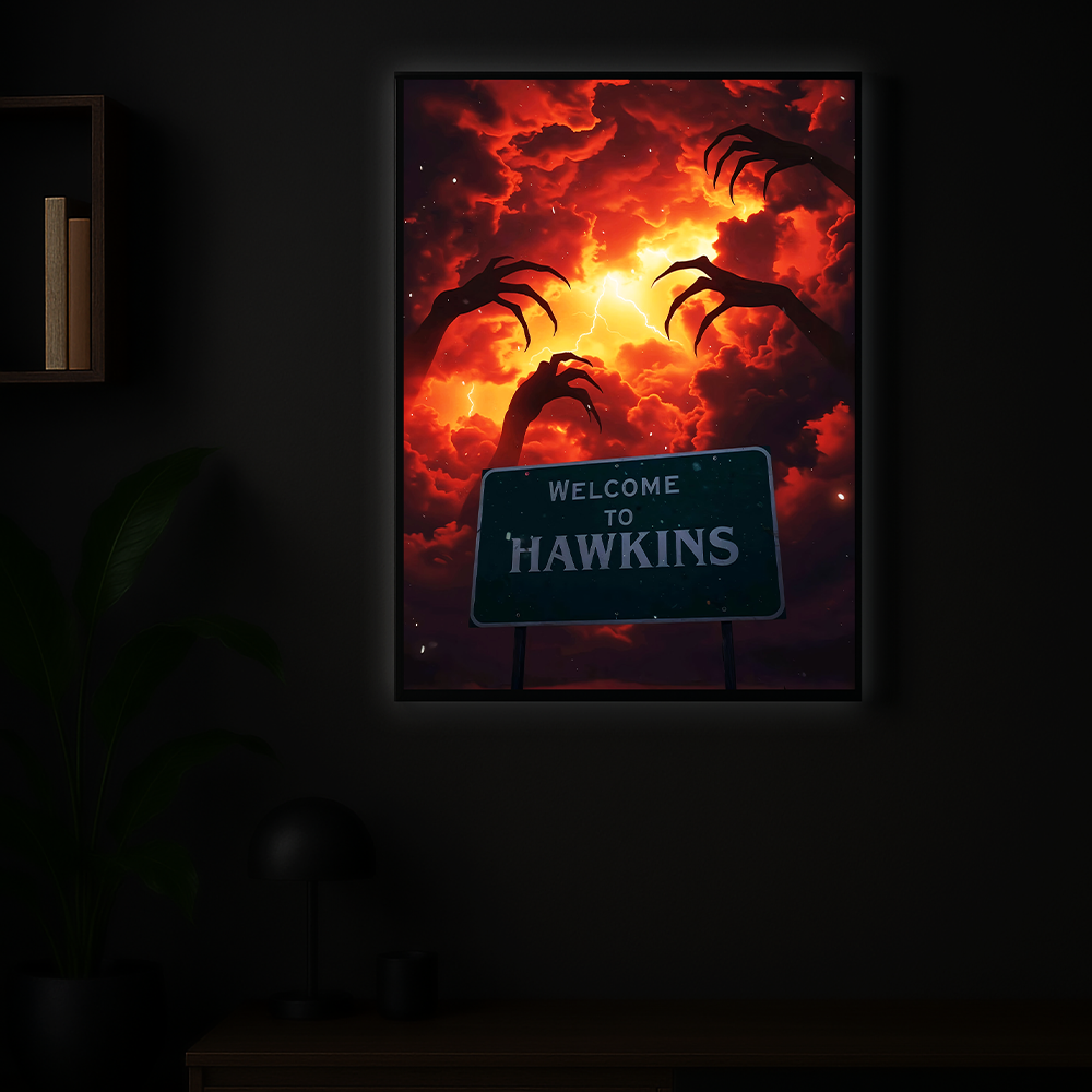 Step into the eerie charm of small-town mystery with this 1 cm thin illuminated glass poster inspired by Welcome to Hawkins. Printed in ultra-high resolution on tempered glass, the design captures every nostalgic detail—from flickering streetlights to the haunting silhouette of the Upside Down.